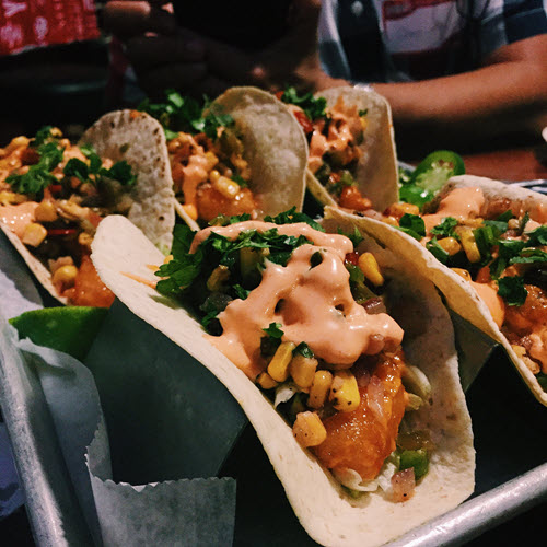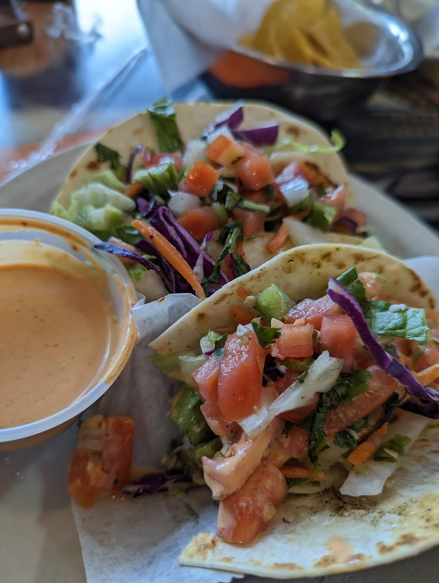 Steak Tacos Chips and Salsa and a Dos Equis Amber